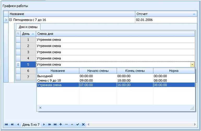 График работы может быть задан для пятидневного, шестидневного и сменных режимов рабочего времени. Таким образом, система учета рабочего времени может быть гибко настроена под любые режимы работы с произвольной периодичностью, например, сутки через трое и т.п.